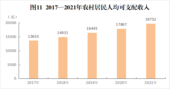 全市农村居民人均可支配收入为19752元,增长10.5%。其中,工资性收入9145元,增长10.5%;经营净收入7943元,增长10.8%;财产净收入516元,增长10.6%;转移净收入2148元,增长9.8%。农村居民人均消费支出15004元,增长10.8%。其中,食品支出5321元,增长10.3%;衣着支出1358元,增长14.0%;居住支出2668元,增长10.3%;生活用品及服务支出1342元,增长12.2%;交通通信支出1573元,增长8.7%;教育文化娱乐支出1012元,增长13.8%;医疗保健支出1407元,增长9.2%;其他用品和服务支出323元,增长13.8%。
