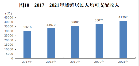 全市城镇居民人均可支配收入为41307元,增长8.5%。其中,工资性收入27338元,增长8.4%;经营净收入5973元,增长9.9%;财产净收入2482元,增长11.4%;转移净收入5514元,增长6.2%。城镇居民人均消费支出25675元,增长7.5%。其中,食品支出8818元,增长7.4%;衣着支出2721元,增长7.9%;居住支出4151元,增长8.4%;生活用品及服务支出2639元,增长8.2%;交通通信支出2616元,增长7.8%;教育文化娱乐支出2163元,增长13.7%;医疗保健支出1833元,下降0.9%;其他用品和服务支出734元,增长3.0%。