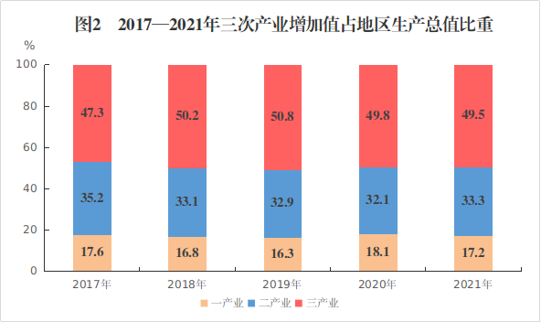 全市地区生产总值(GDP)1417.8亿元,按可比价计算,比上年(下同)增长8.1%。其中,第一产业增加值243.5亿元,增长7.3%;第二产业增加值472.2亿元,增长8.6%;第三产业增加值702.1亿元,增长8.1%。三次产业对经济增长贡献率分别为16.3%、33.9%和49.8%。三次产业结构由上年的18.1:32.1:49.8调整为17.2:33.3:49.5。