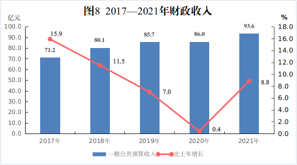 全年一般地方公共预算收入93.6亿元,增长8.8%。其中,税收性收入47.8亿元,增长7.9%,占地方一般公共预算收入51.1%。地方一般公共预算支出295.0亿元,增长0.1%。