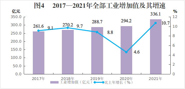 全年工业增加值336.1亿元,增长10.7%,对经济增长贡献率29.8%。年末规模以上工业企业639户。全年规模以上工业增加值增长9.9%,其中轻工业增加值增长14.3%,重工业增加值增长7.8%。工业投资增长10.7%。工业税收12.6亿元,增长2.8%。新培育规模以上工业企业62户。
