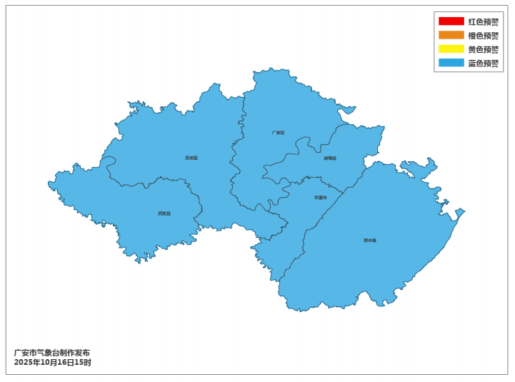 广安市气象台2025年10月16日15时20分发布暴雨蓝色预警:预计今天晚上到明天白天,我市有一次强降雨天气过程,武胜、岳池、广安区、华蓥、前锋区、邻水有大雨到暴雨(雨量30-80毫米),最大小时雨强30-40毫米,强降雨主要集中在明天凌晨到上午。过程中伴有雷电、短时强降水、阵性大风等强对流天气。