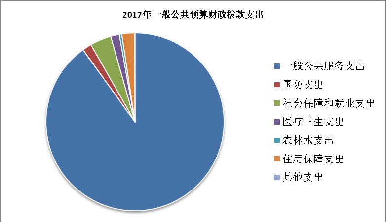 2017年一般公共预算财政拨款支出1362.79万元,主要用于以下方面:一般公共服务支出1227.49万元,占90.07%;国防支出22.9万元,占1.68%;社会保障和就业支出52.37万元,占3.84%;医疗卫生支出21.21万元,占1.56%;农林水支出6.16万元,占0.45%;住房保障支出31.42万元,占2.31%。其他支出1.24万元,占0.09%。(图5:一般公共预算财政拨款支出决算结构)(饼状图)