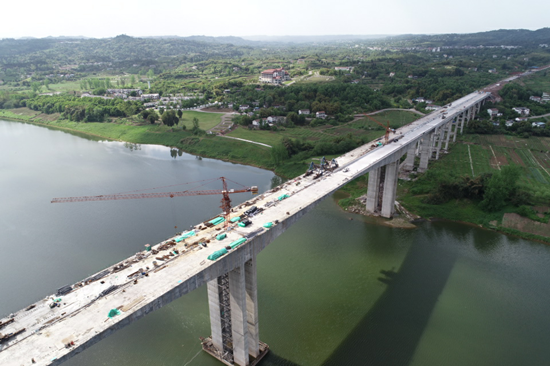 大龙渠江特大桥横跨美丽的渠江,连接着广安区和广安经开区,是广安内目前最大跨径的连续刚构桥。全桥长940米,主跨跨径180米,桥宽26.5米,采用双向4车道一级公路设计标准,设计时速60公里。大桥采用单箱双室预应力混凝土结构,挂篮安装、验收、行走及悬臂节段浇筑等关键环节均需重点把控,施工管理难度较大,安全风险较高。该桥建成后,将缩短广安枣山至前锋运输里程,有效提高物资转运效率,降低物流成本,对发展区域经济具有重要意义。