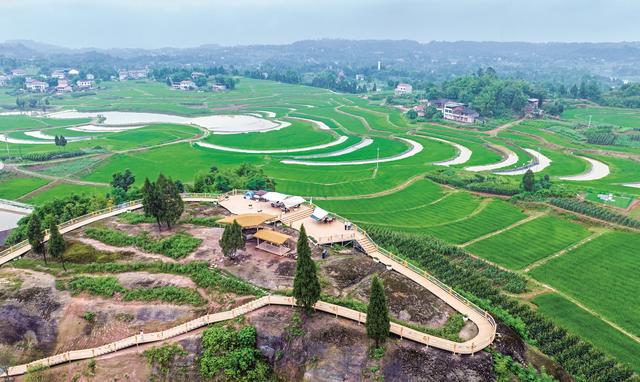 6月10日,前锋区观塘镇仁和村成片的稻鱼产业与仁和寨露营基地构成了一幅美丽的农旅融合画卷。